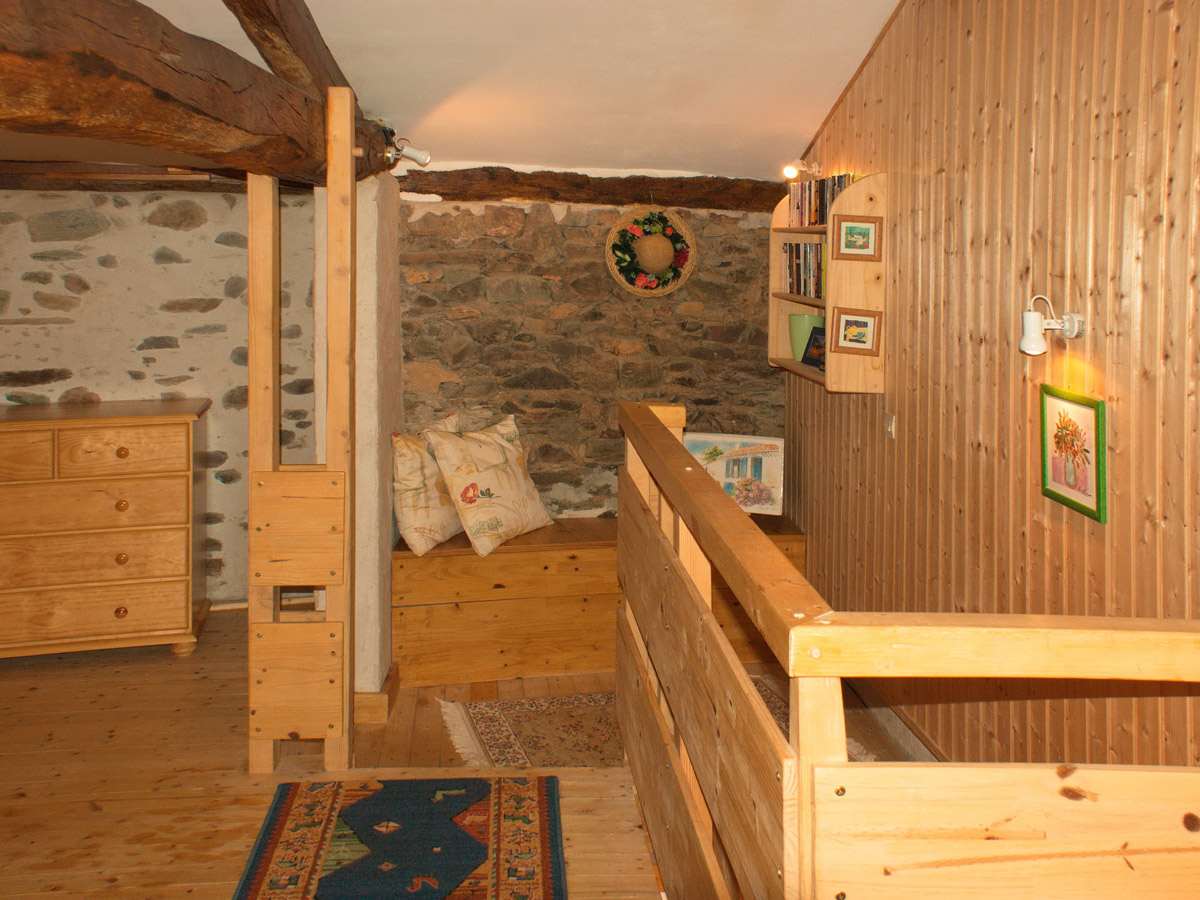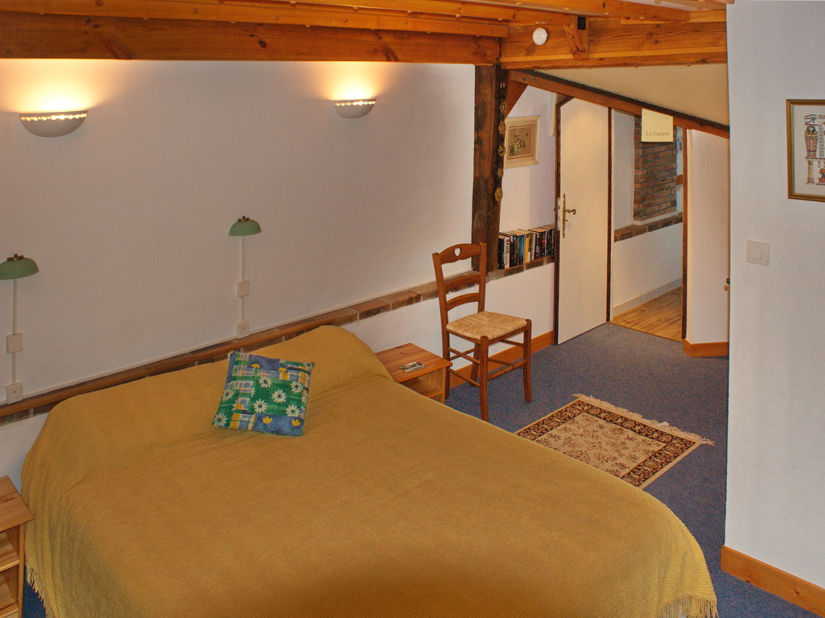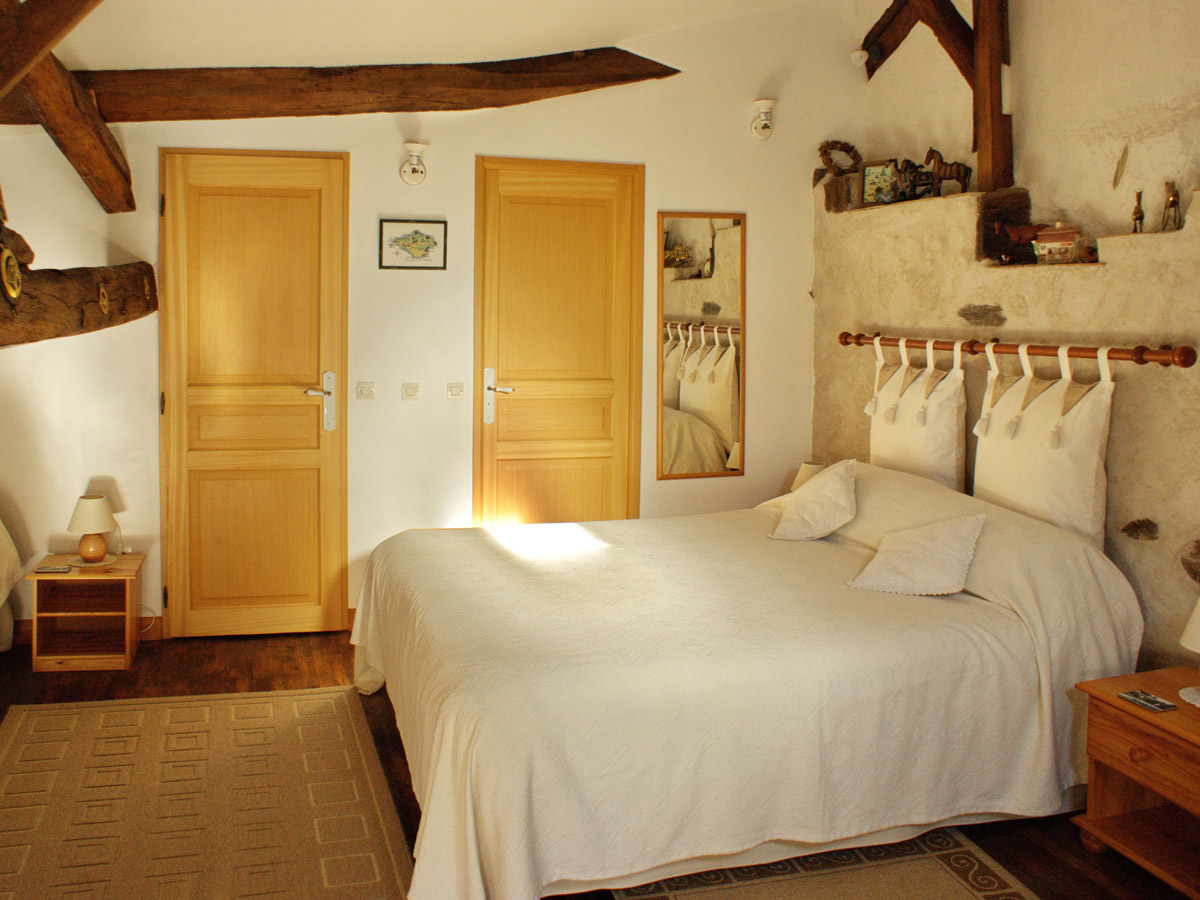 The watermill at le Moulin du Chemin is constructed on the side of a shallow valley, on three floors, stepped one above the other, up the hillside. La Chamber des Poutres on the first floor and is accessed by a short flight of stairs from the Pergola to the Guests’ Landing.