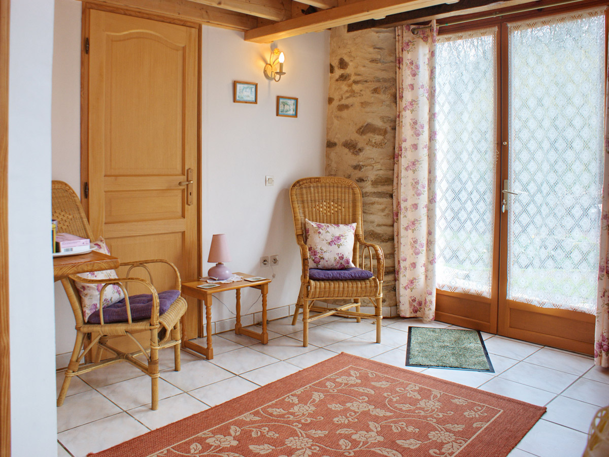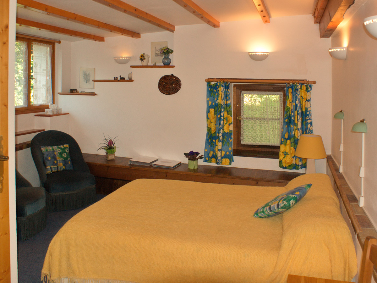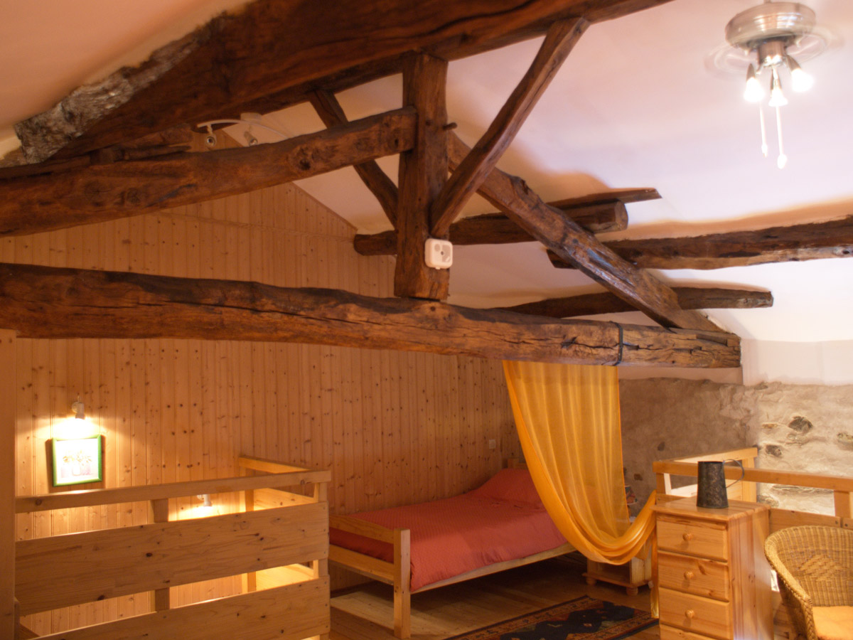 The watermill at le Moulin du Chemin is constructed on the side of a shallow valley, on three floors, stepped one above the other, up the hillside. La Chamber des Poutres on the first floor and is accessed by a short flight of stairs from the Pergola to the Guests’ Landing.