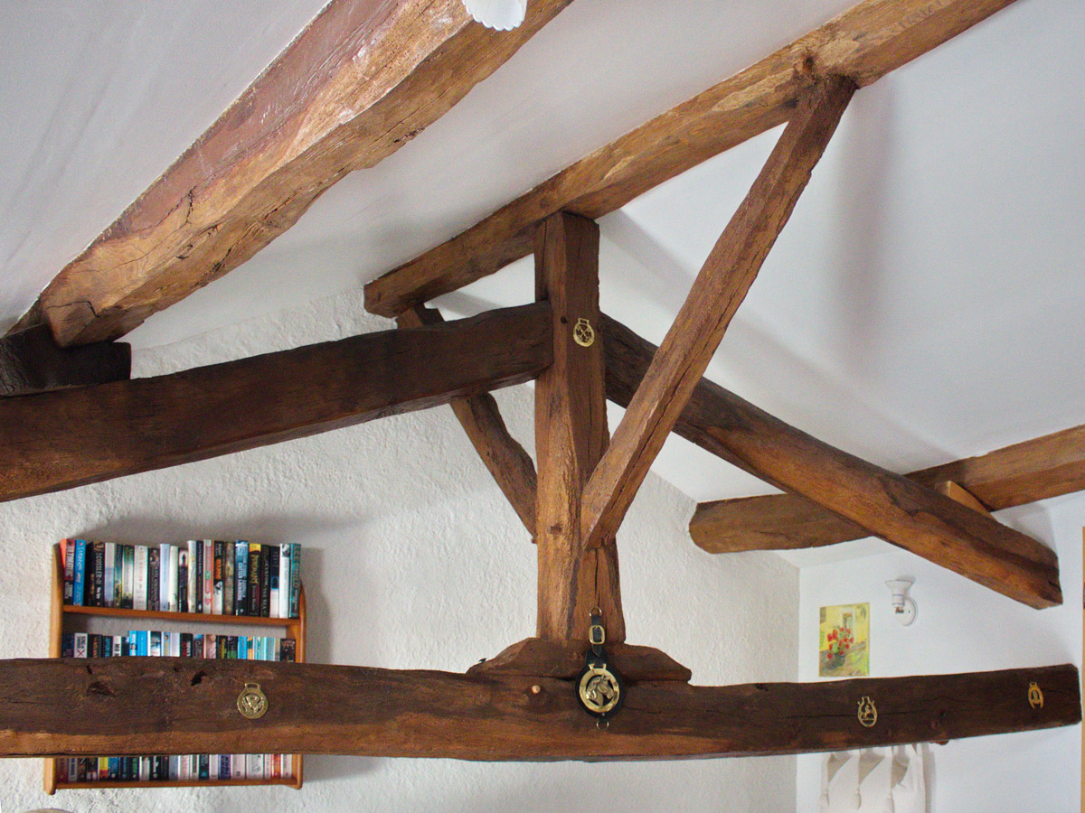 The blackened notched oak roof timber in the ceiling closest to the window probably dates from the Dark Ages. It almost certainly originated as a wall-timber in the far-off days of mud and wattle walling. Other timbers show marks of having been worked with an adze.