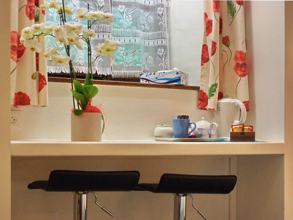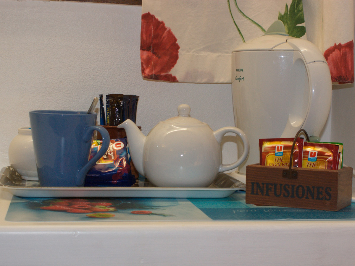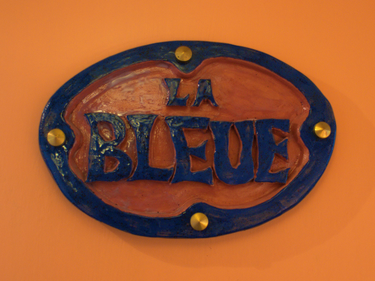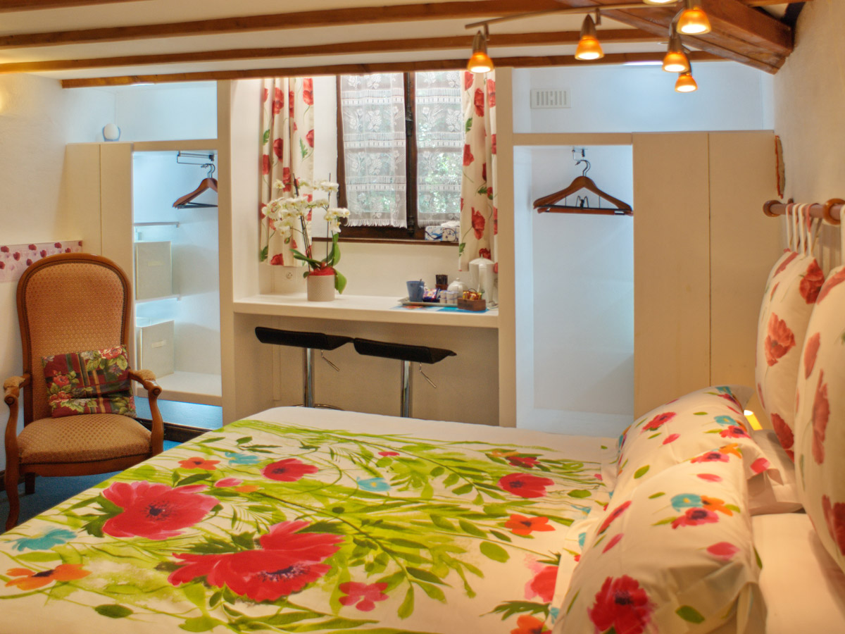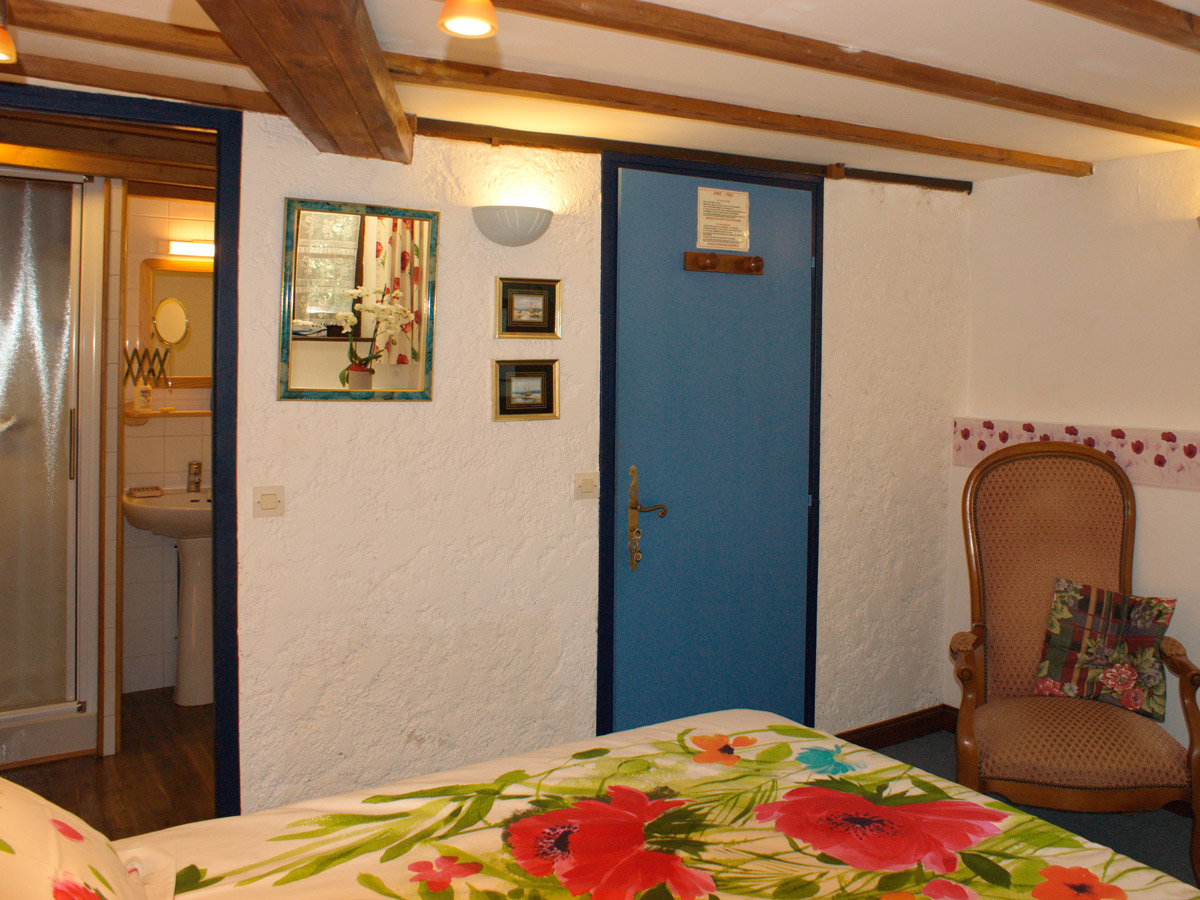 The Blue Room is located on the first floor at le Moulin du Chemin. It is accessed by an external stairway from the ground-floor pergola, via an external door leading to the guests' landing. The guests' landing provides access to three guest rooms, including the Blue Room. The Blue Room includes an ensuite shower/WC, wardrobes (closets), clothes drawers and the following additional items.