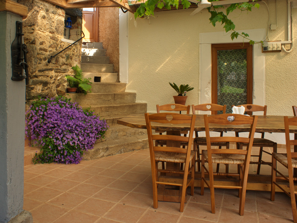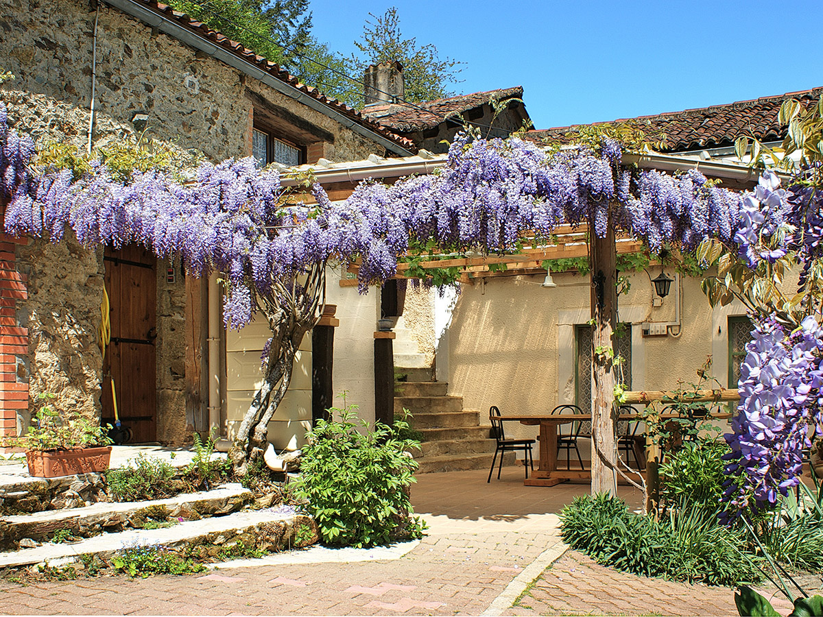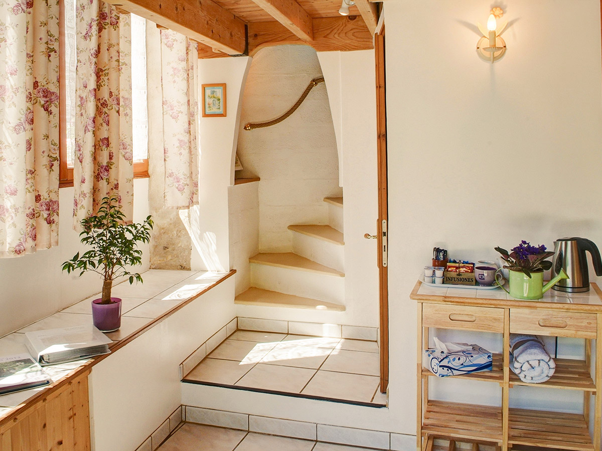 Le Moulin du Chemin is constructed on the side of a shallow valley on three floors, stepped one above the other and cut into the hillside. La Clochard on the second floor and is accessed by an external flight of stairs from the Pergola to the Guests’ Landing and a further flight of stairs from the Guests’ Landing to la Clochard .