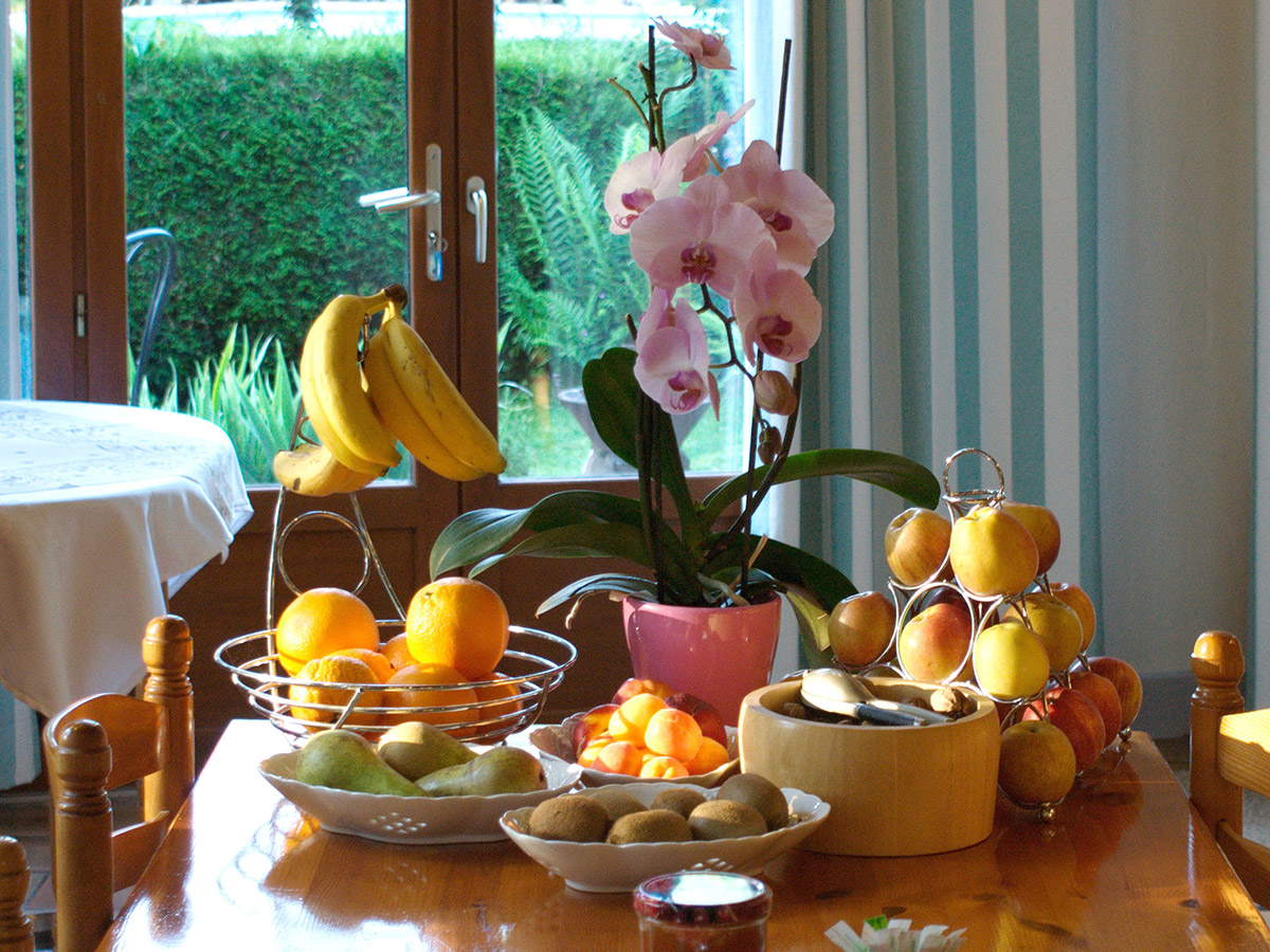 Traditional breakfasts comprise crusty French bread and croissants fresh from the boulangerie each morning, delicious local butter and honey with steaming hot coffee, tea, chocolate or tisane. Conserves – prepared at le Moulin du Chemin using local fruit – muesli, cereal flakes, dried fruit and yoghurt are also provided at breakfast as well as a generous selection of seasonal fresh fruits.