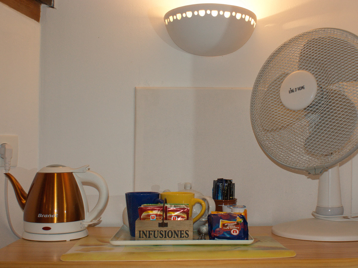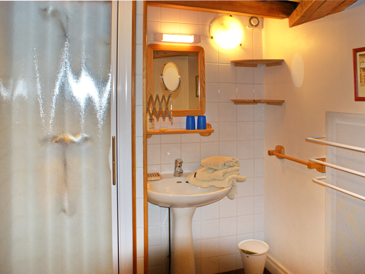 The Blue Room is located on the first floor at le Moulin du Chemin. It is accessed by an external stairway from the ground-floor pergola, via an external door leading to the guests' landing. The guests' landing provides access to three guest rooms, including the Blue Room. The Blue Room includes an ensuite shower/WC, wardrobes (closets), clothes drawers and the following additional items.