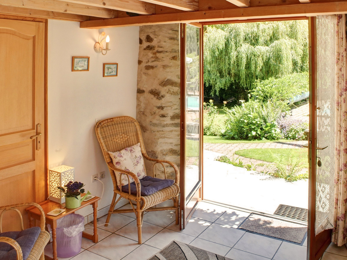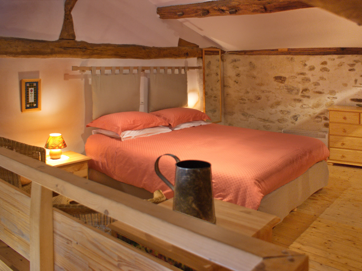 The watermill at le Moulin du Chemin is constructed on the side of a shallow valley, on three floors, stepped one above the other, up the hillside. La Chamber des Poutres on the first floor and is accessed by a short flight of stairs from the Pergola to the Guests’ Landing.