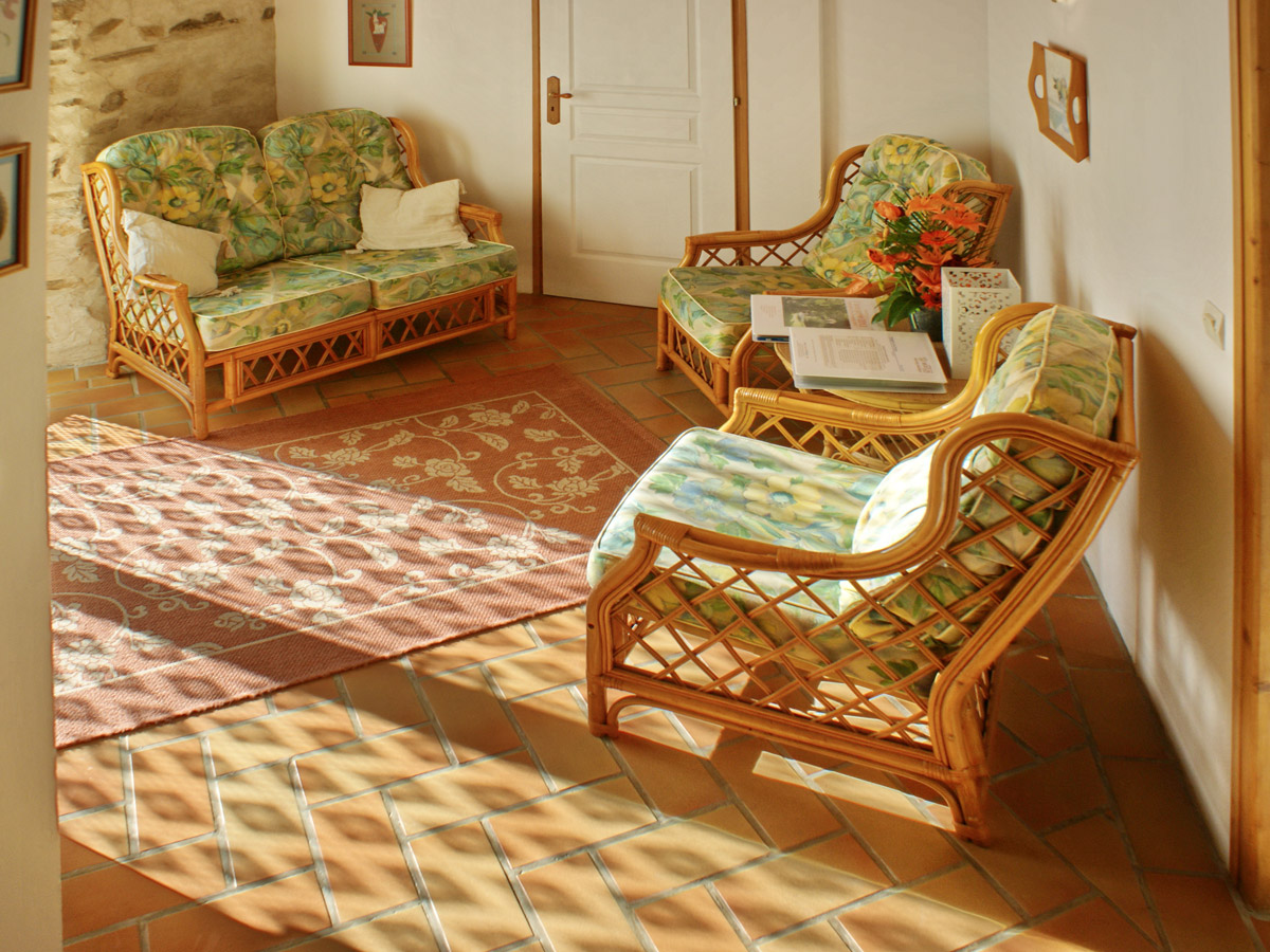 Le Moulin du Chemin is constructed on the side of a shallow valley on three floors, stepped one above the other and cut into the hillside. La Clochard on the second floor and is accessed by an external flight of stairs from the Pergola to the Guests’ Landing and a further flight of stairs from the Guests’ Landing to la Clochard .